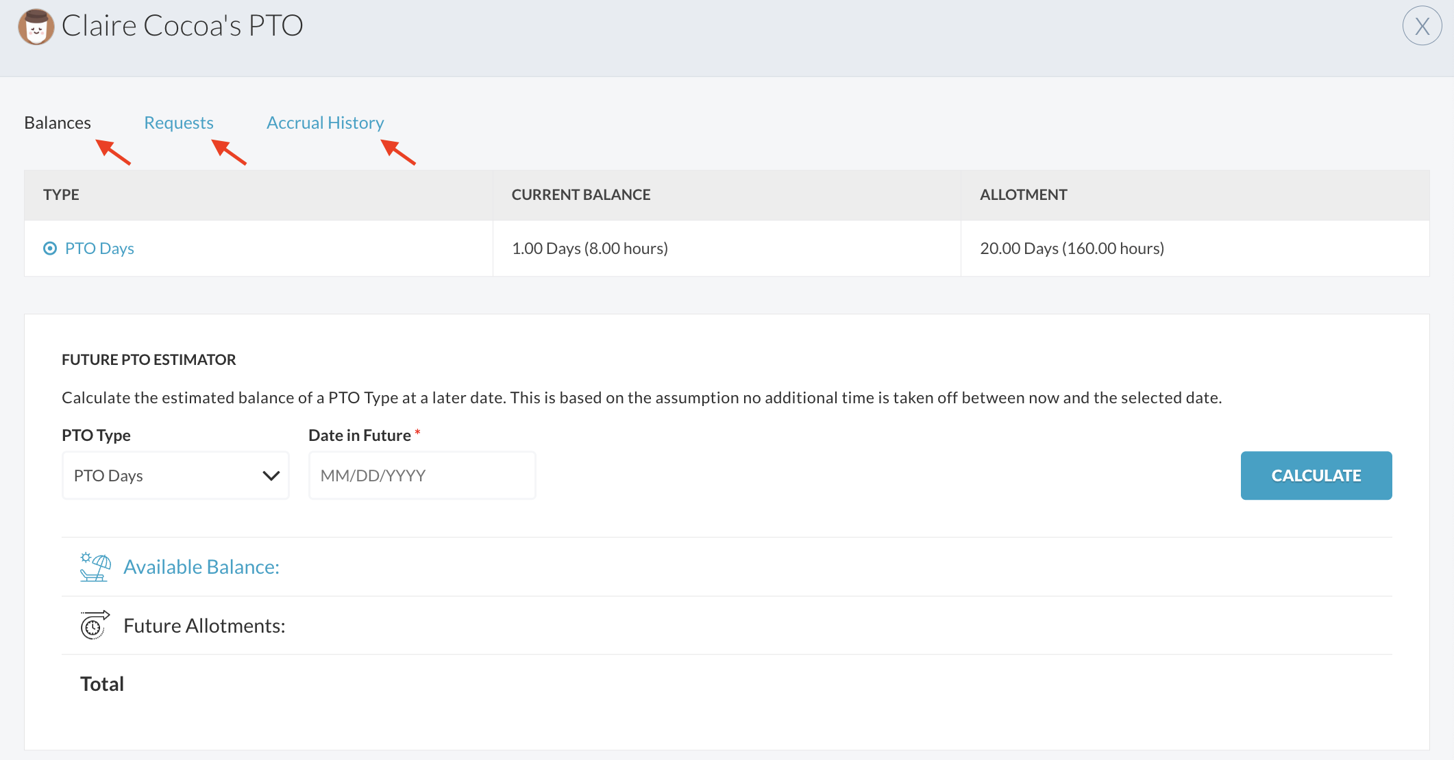 - Review the pop-up modal displaying current balances, requests and accrual history