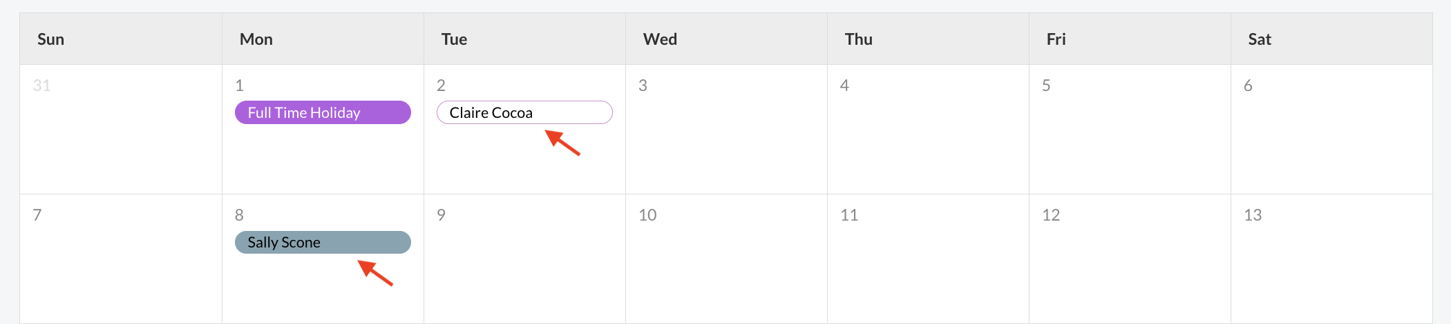- Approved requests- Filled bubbles show confirmed time off that will impact staffing