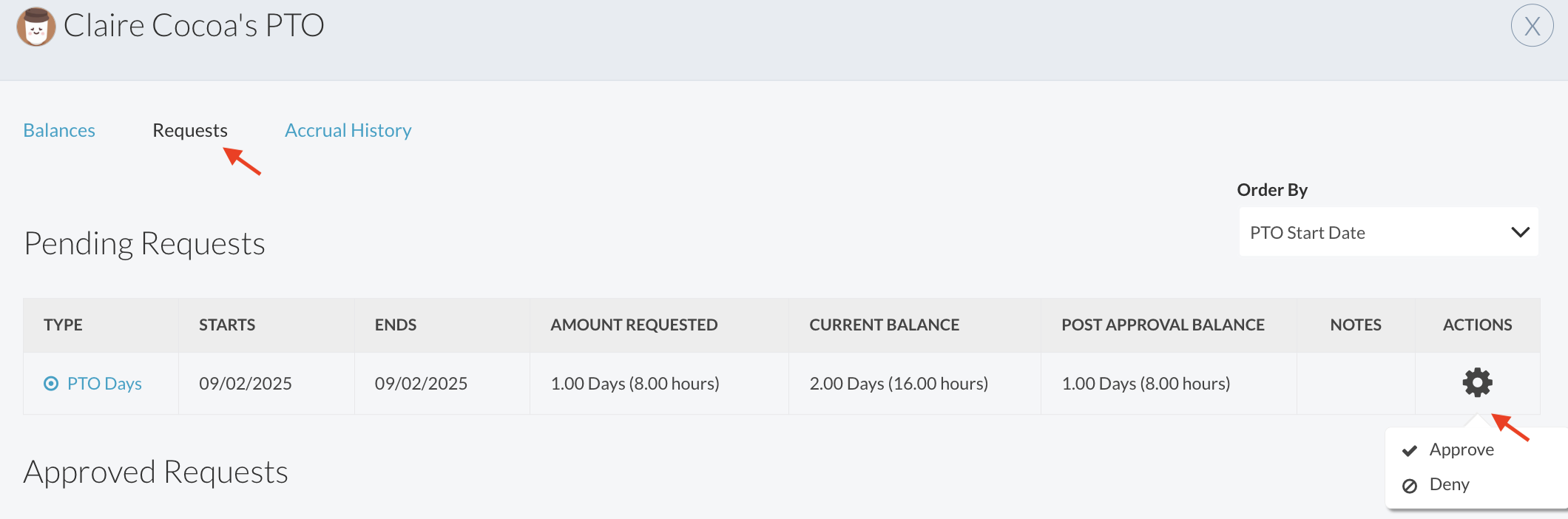 - Approve or deny requests- Hover over the action gear to make approval decisions on pending requests