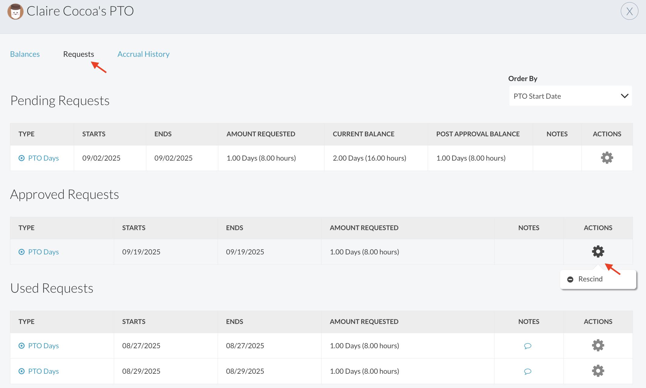 - Rescind approved time- Hover over the action gear for approved or used requests to rescinded