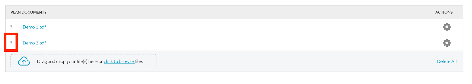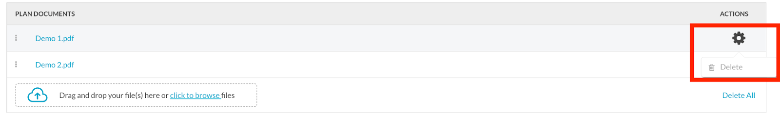 In the Plan Documents section, mouse over the gear wheel to reveal the menu, then click Delete.