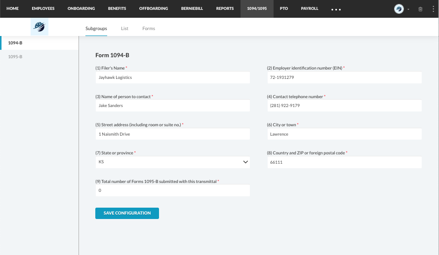 Once you have finished the 1094-B subgroup configuration, you can move to the 1095-B configuration: