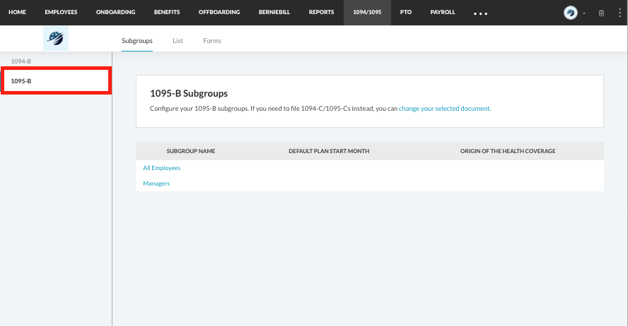 Click the subgroup name of each 1095-B to indicate the default start month and origin of the health coverage. The 1095-B subgroups are based on your Benefits Subgroups in BerniePortal.
