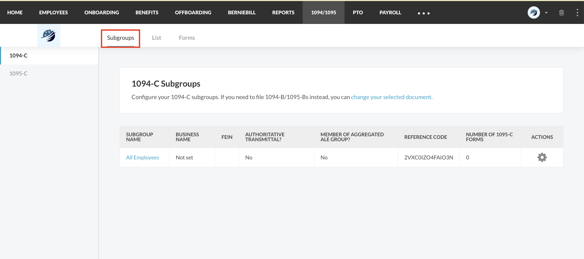 Once you have finished configuring your subgroups, you should navigate HERE to begin configuring your subgroups. Click on your 1094 subgroups to configure them. In the image below, we will click “All Employees” to begin our configuration: