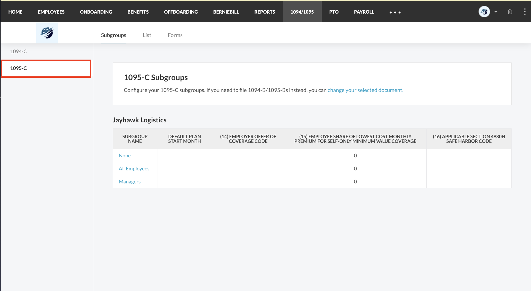 Click the subgroup name of each 1095-C to indicate the default values for Lines 14-16 of the 1095-C forms. The 1095-C subgroups are based on your Benefits Subgroups in BerniePortal.