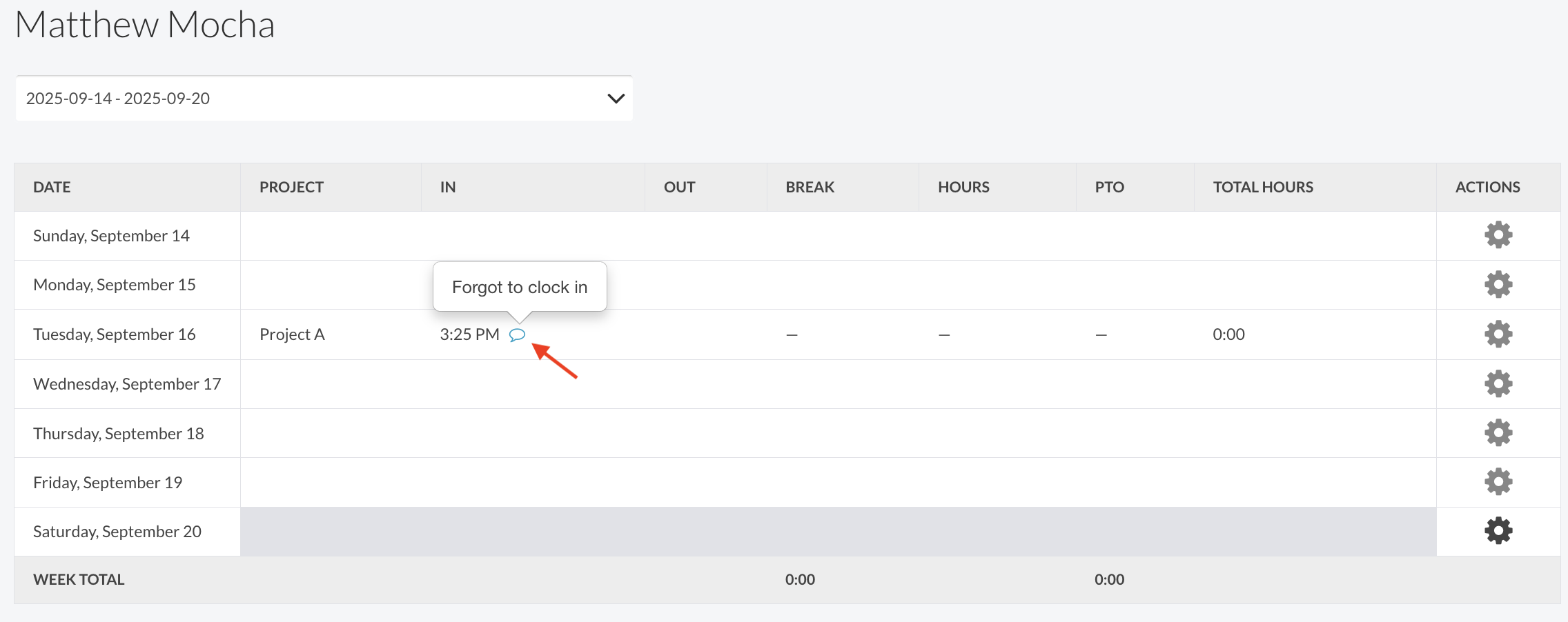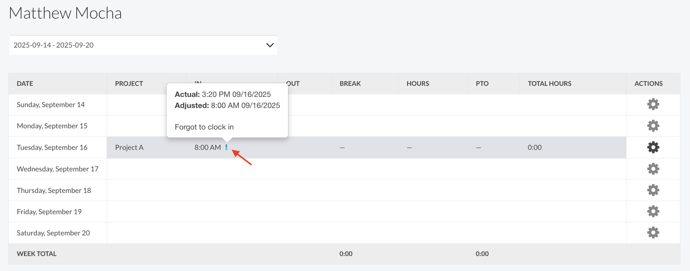 - Hover over the exclamation point to view edit summary (original time, adjusted time, and employee's reason)