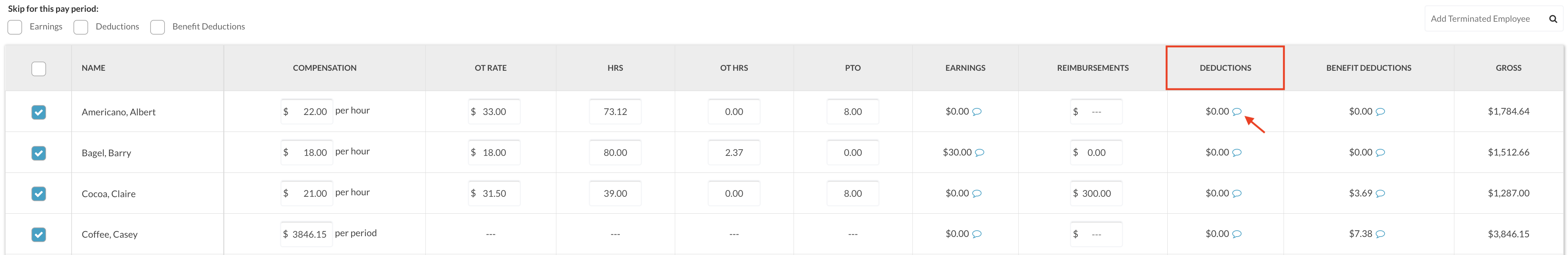 - Review employee “Deductions” by selecting the bubble beside that employee’s Deductions total