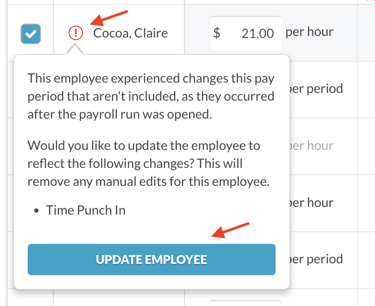 - Click the icon to view a Summary of the change in the Employee's information, and click "Update Employee" to apply the change to the Payroll Edit page