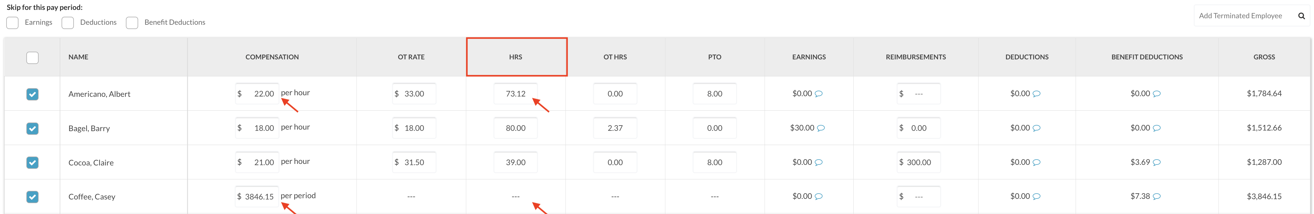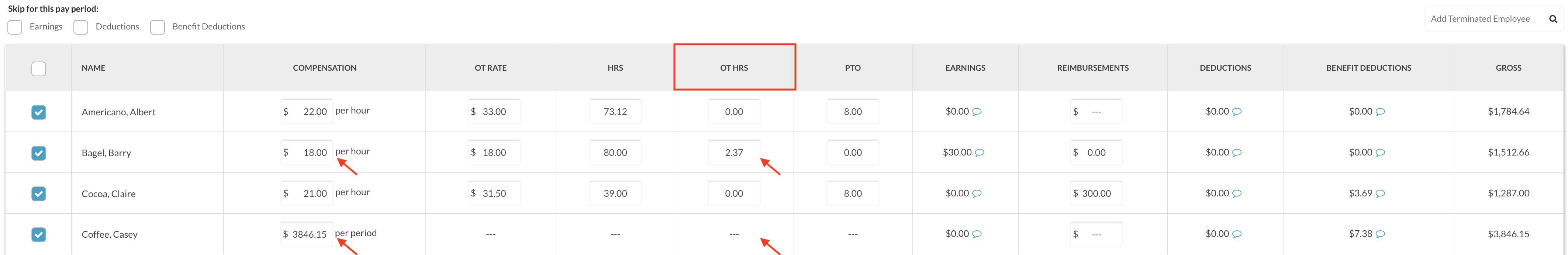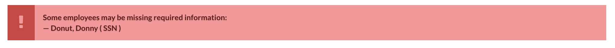 - Payroll warnings- If any employees are missing crucial information, an error message will display in red at the top of the table