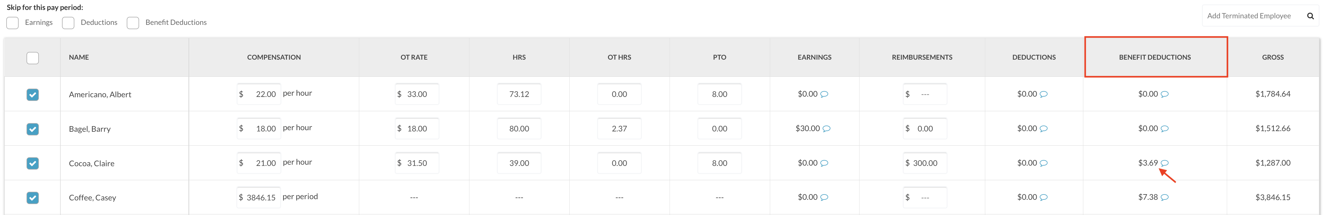 - Review a breakdown of employee “Benefit Deductions” by selecting the bubble beside that employee’s Benefit Deductions total