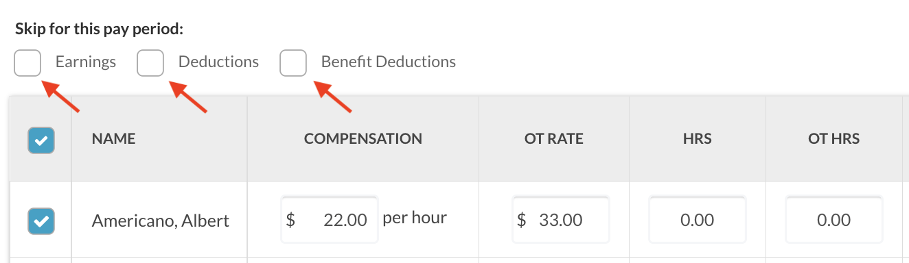 - Payroll information- If certain payroll items do not need to be included for the pay period, they can easily be excluded- Simply check the "Skip for this pay period" box next to any component that should be excluded