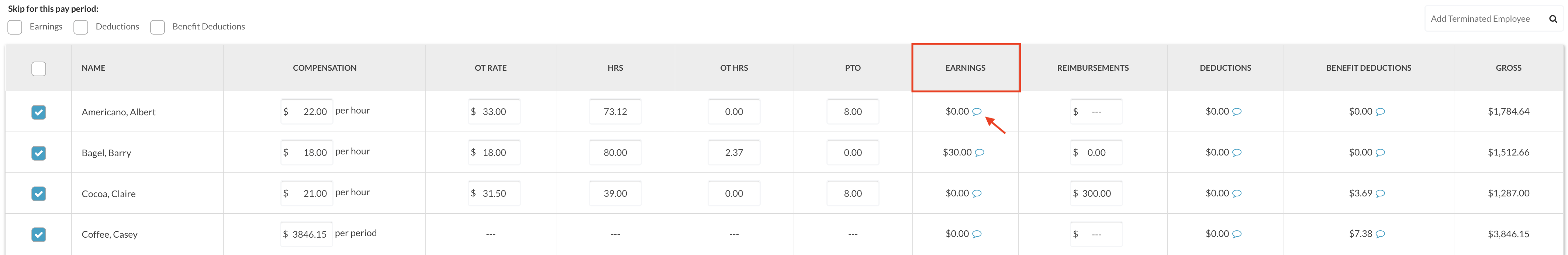 - Review employee “Earnings” by selecting the bubble beside that employee’s Earnings total
