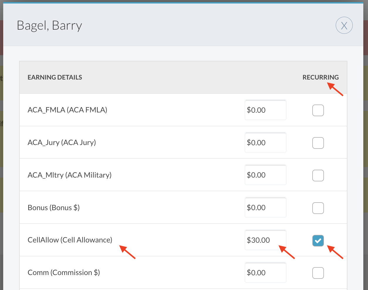 - Select the “Recurring” checkbox beside an Earning type to repeat that Earning Type and Amount each pay period