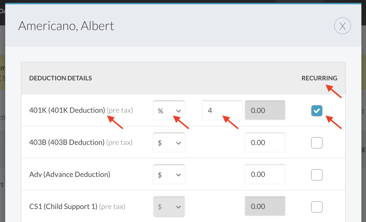 - Select the “Recurring” checkbox beside a Deduction type to repeat that Deduction Type and Amount each pay period