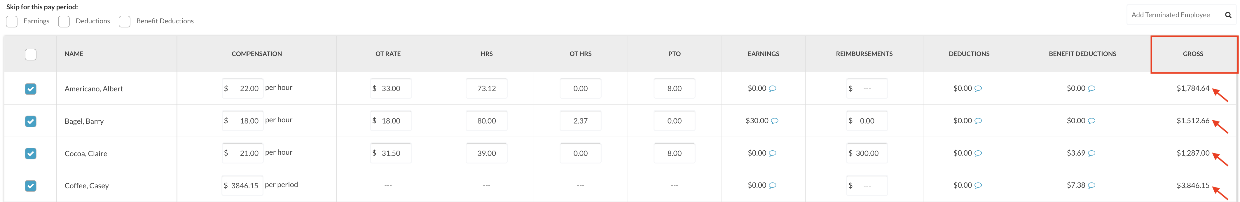 - If any employees should be excluded from the payroll run, use the checkbox beside their name to deselect them
