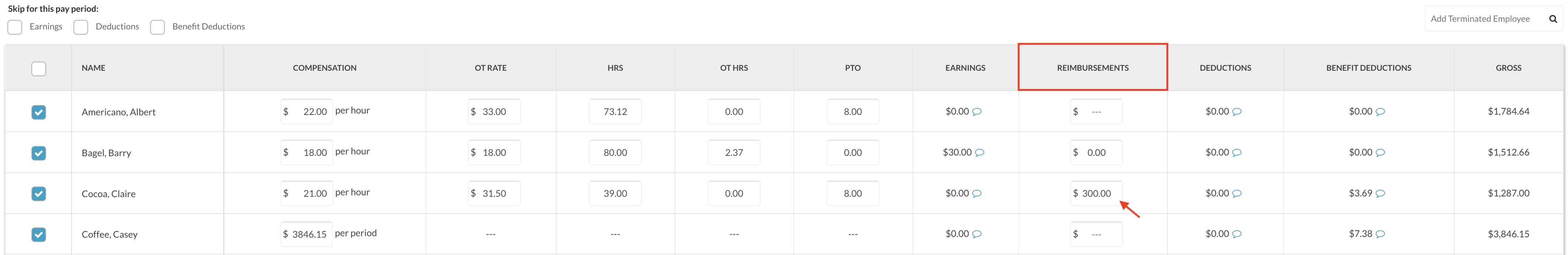 - Enter an employee's Reimbursement total in their "Reimbursements" field
