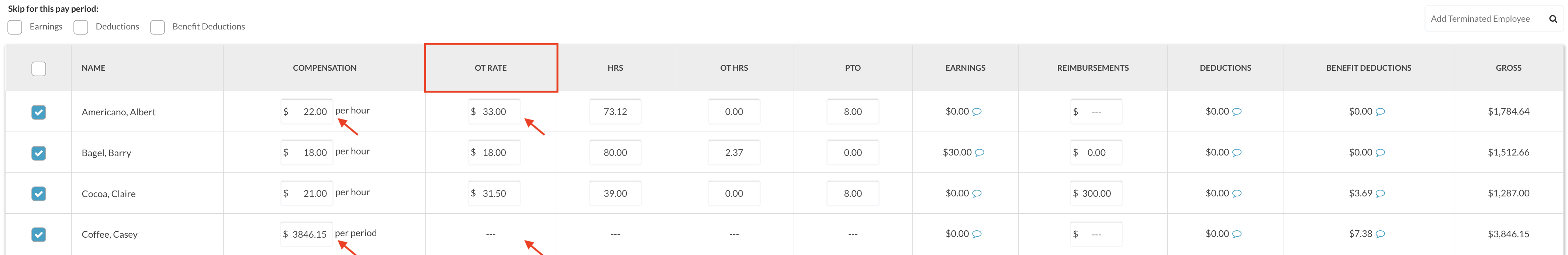 - Hourly/Non-exempt employees will display their Hourly Overtime Rate (Rate per Hour * Overtime Factor)