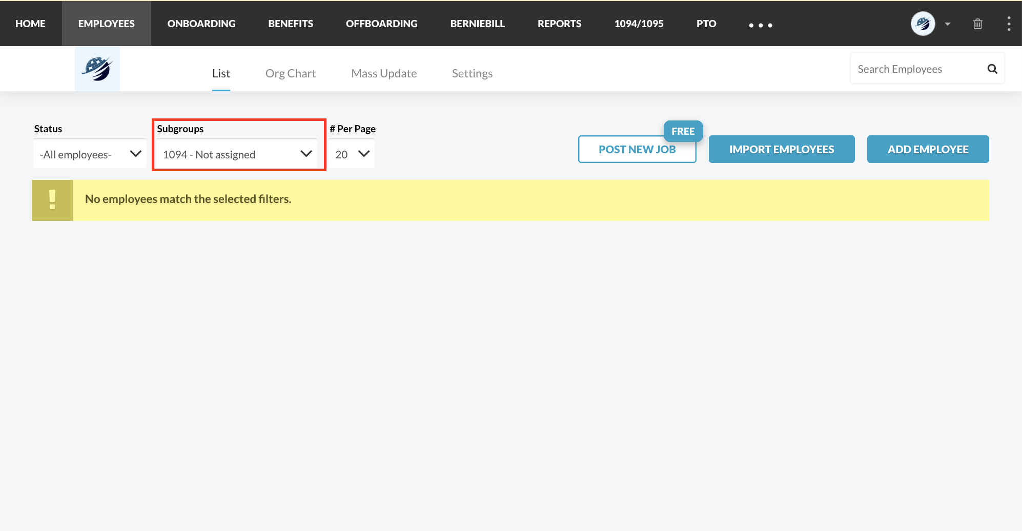 If employees are not assigned, make sure to assign them to a 1094 subgroup. You can do this individually for each employee, or you can mass-assign employees into 1094 subgroups. We will review this in the next step below.