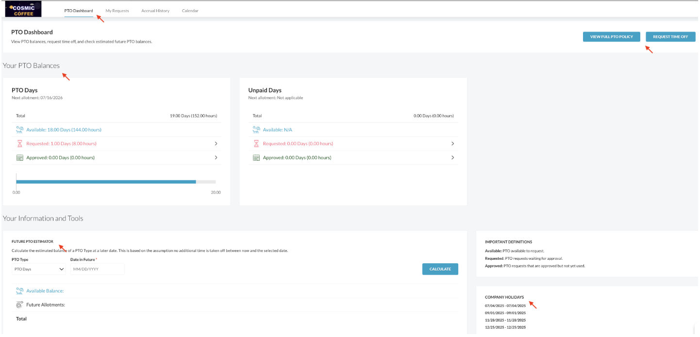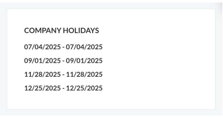 - Company holidays designated by the employer appear at the bottom left of the PTO Dashboard