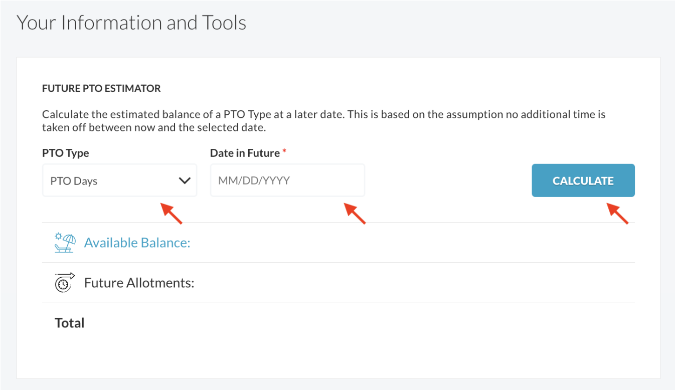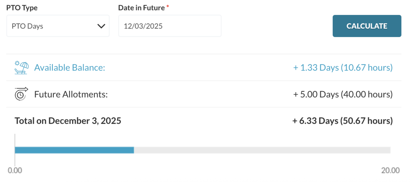 - The PTO Estimator helps employees plan ahead by showing projected balances for future dates based on accrual schedules