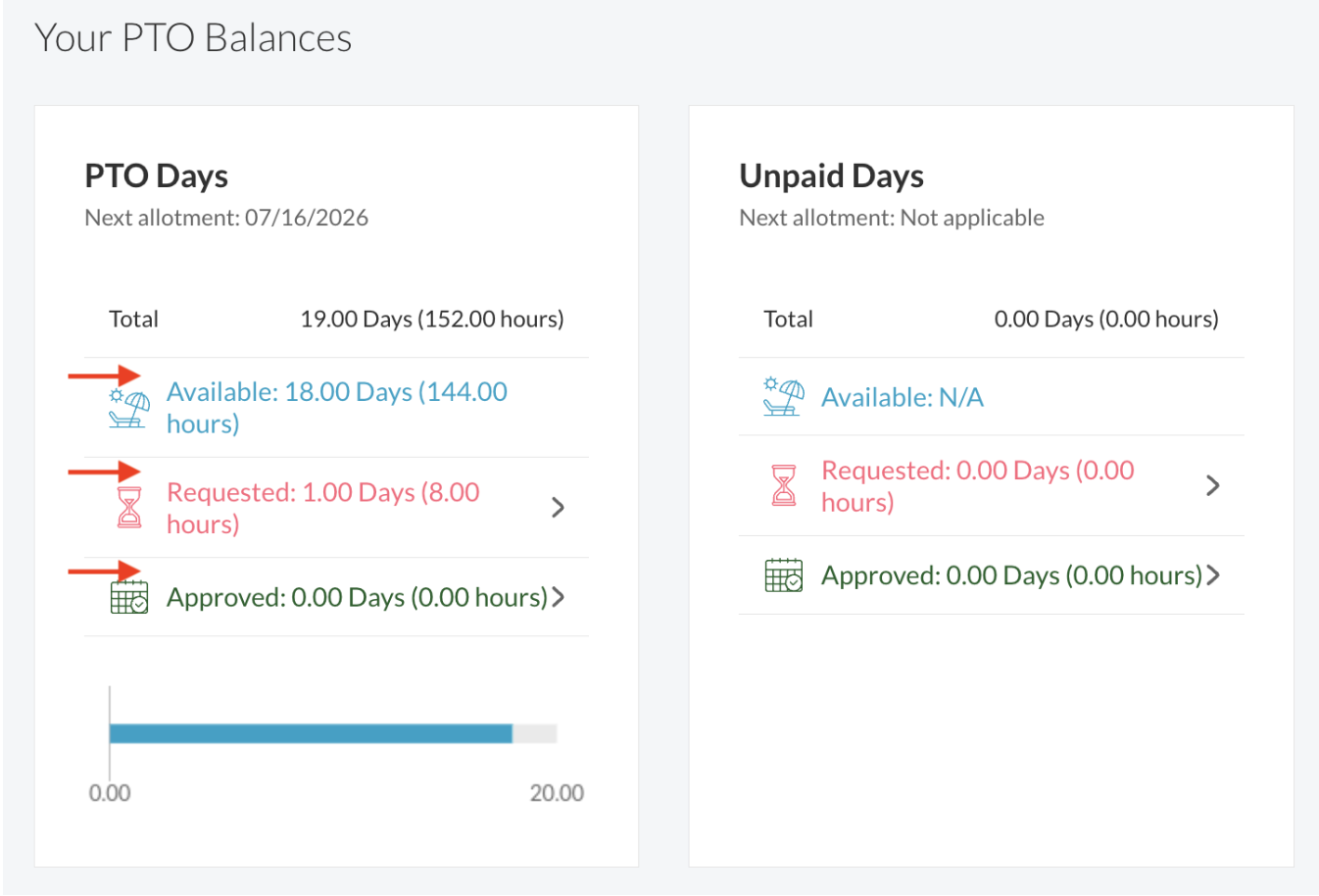 - PTO balances are organized into three clear categories for each time-off type