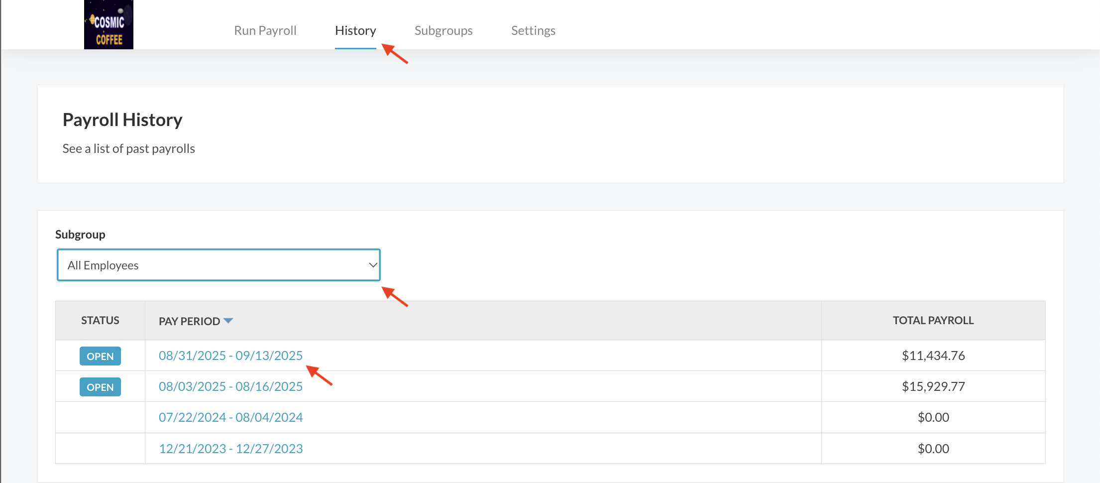 Once payroll is opened in BerniePortal, each run is stored in the “History” tab with a status indicator that tracks the payroll's progress through the processing workflow. To access: Log in to BerniePortal as the Global Administrator or a Payroll ...