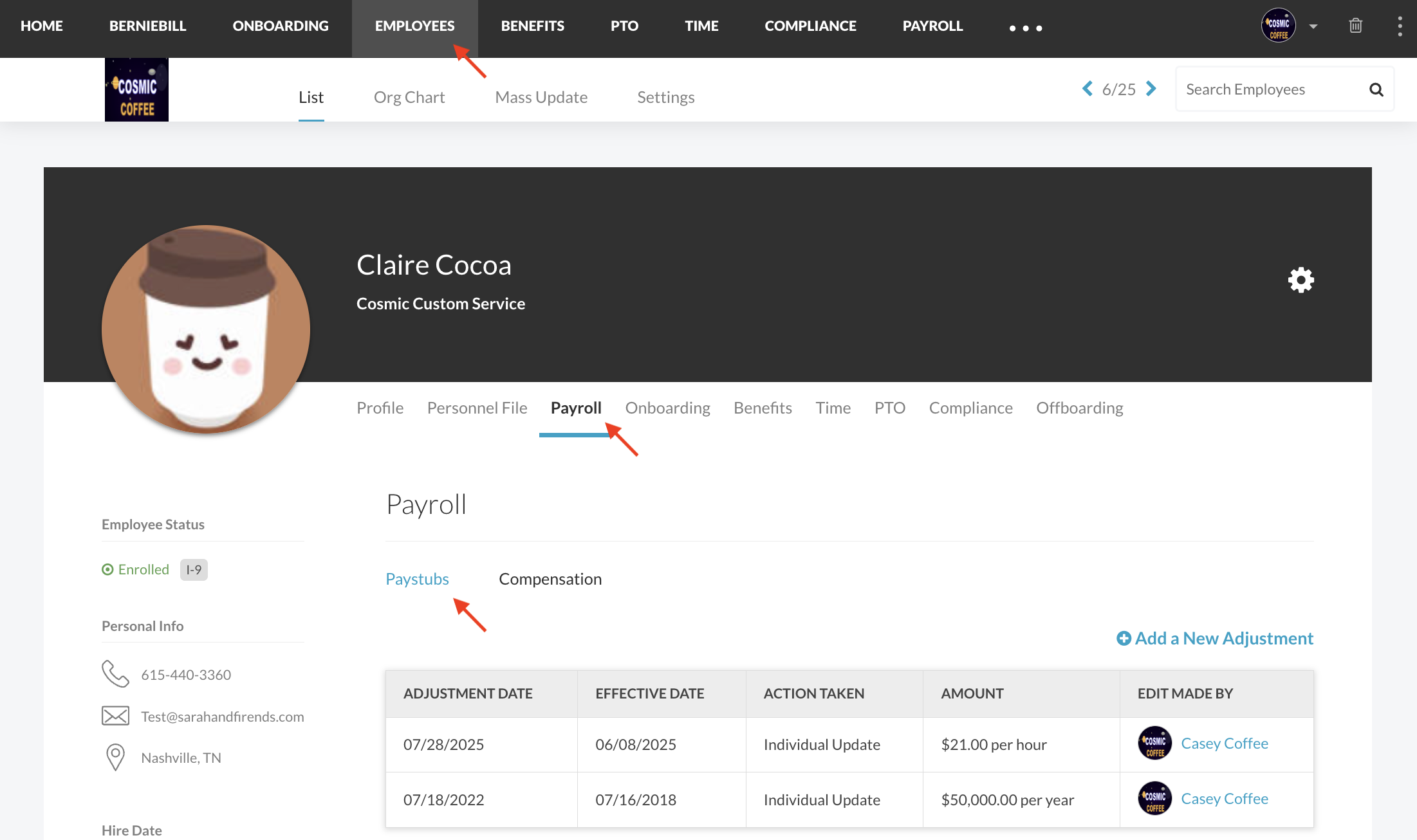 - Select the “Payroll” tab within the employee profile, then “Pay stubs”