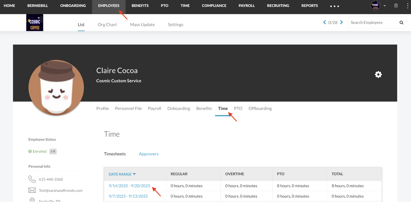 - Select the "Time" tab within the Employee Profile