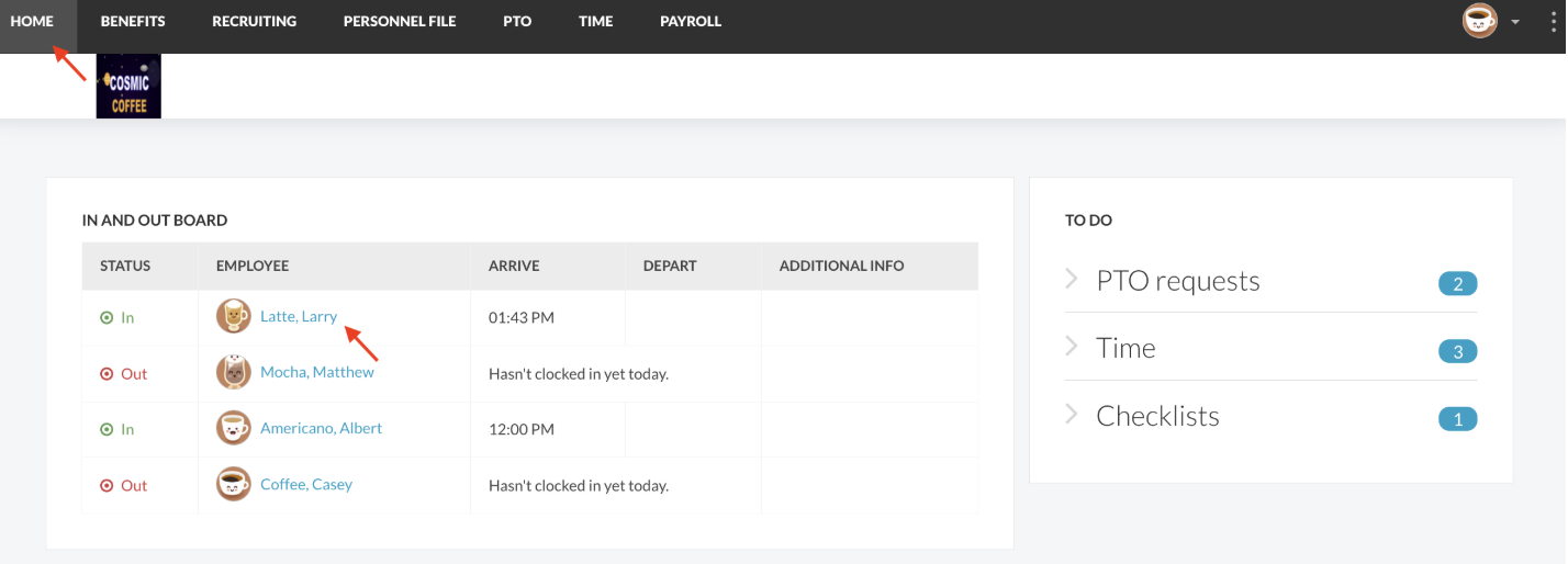 - From the Home page, select the desired employee from the “In and Out Board”