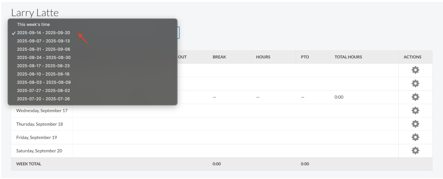 - Use the date range dropdown (top right) to select the timesheet period
