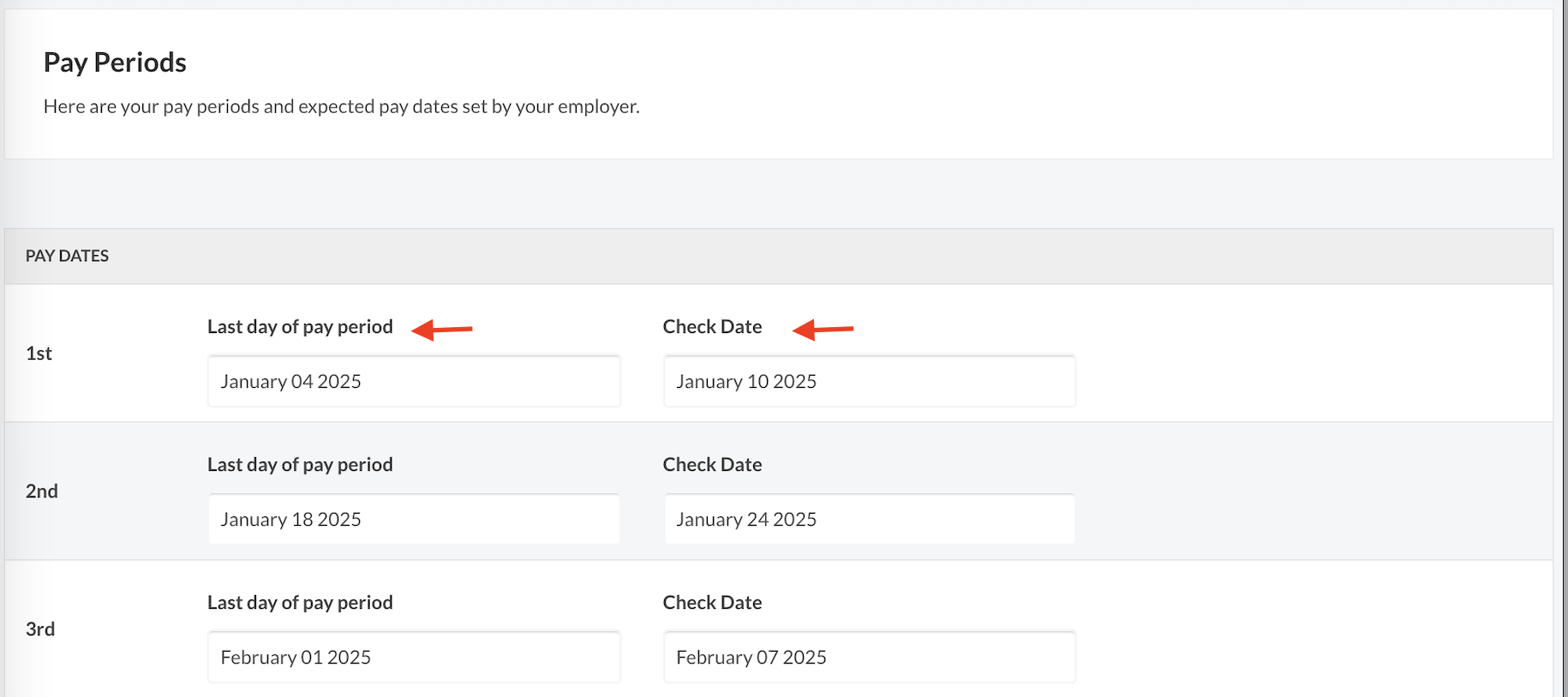 - Check Date- When employees can expect to receive their paycheck or direct deposit