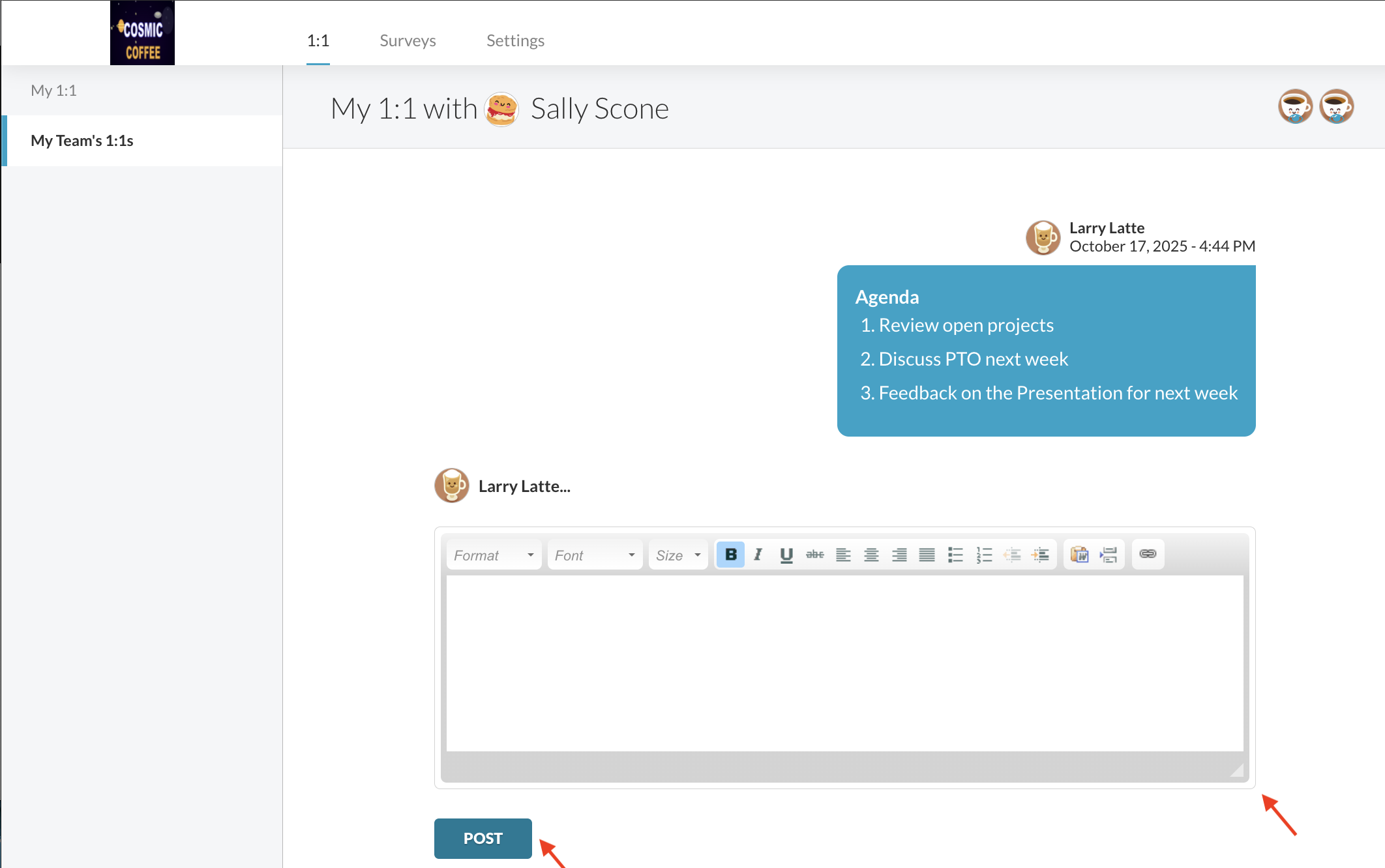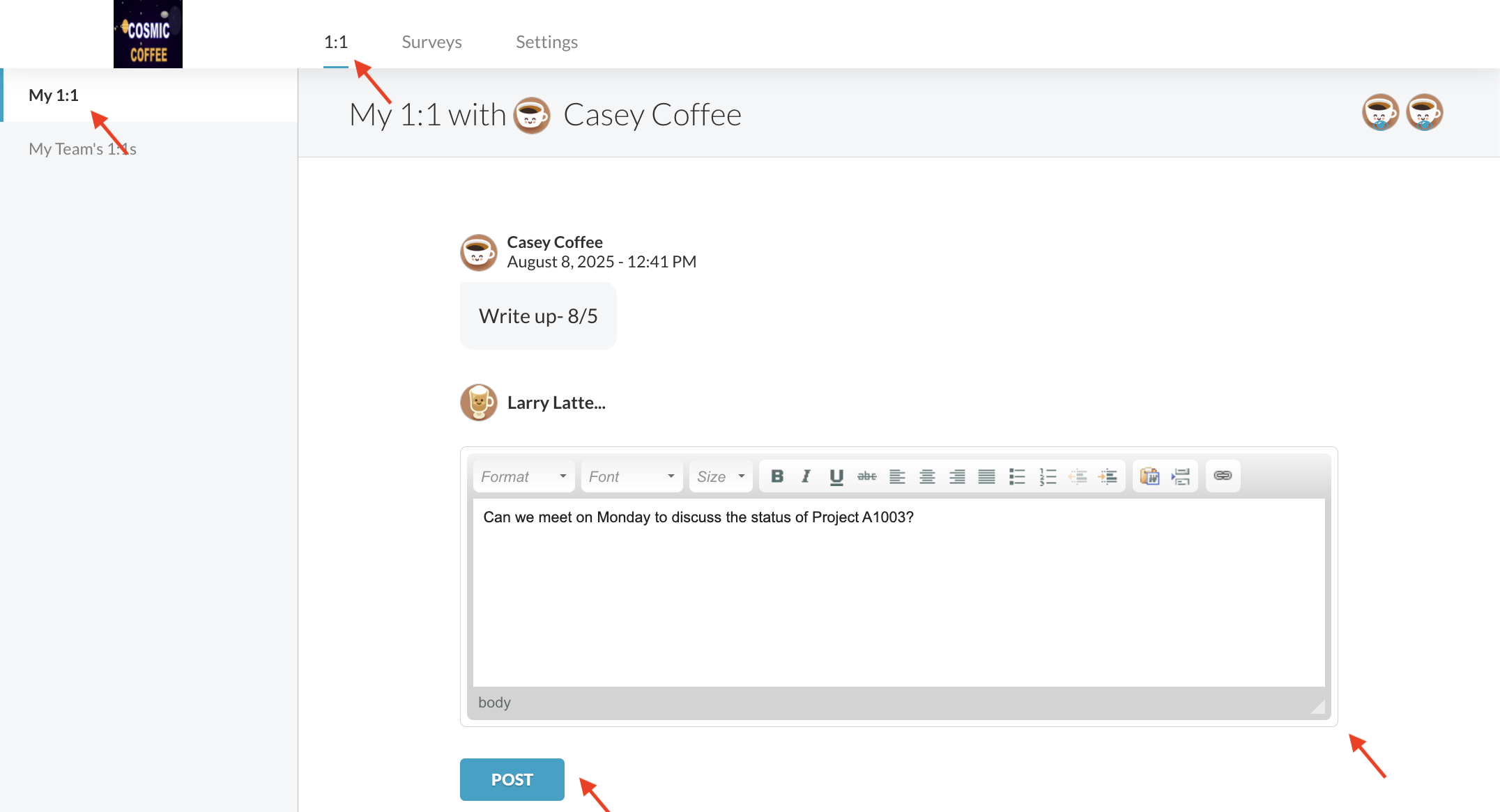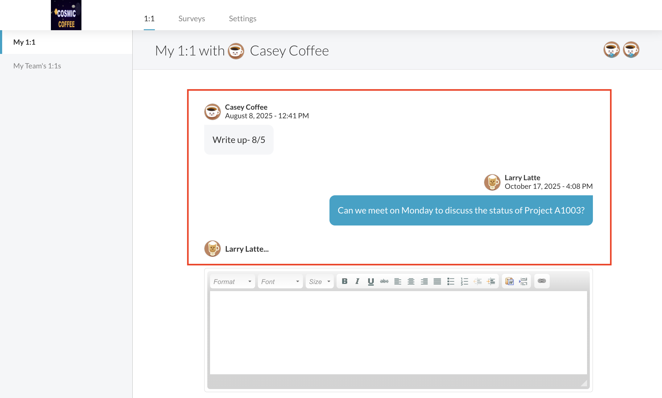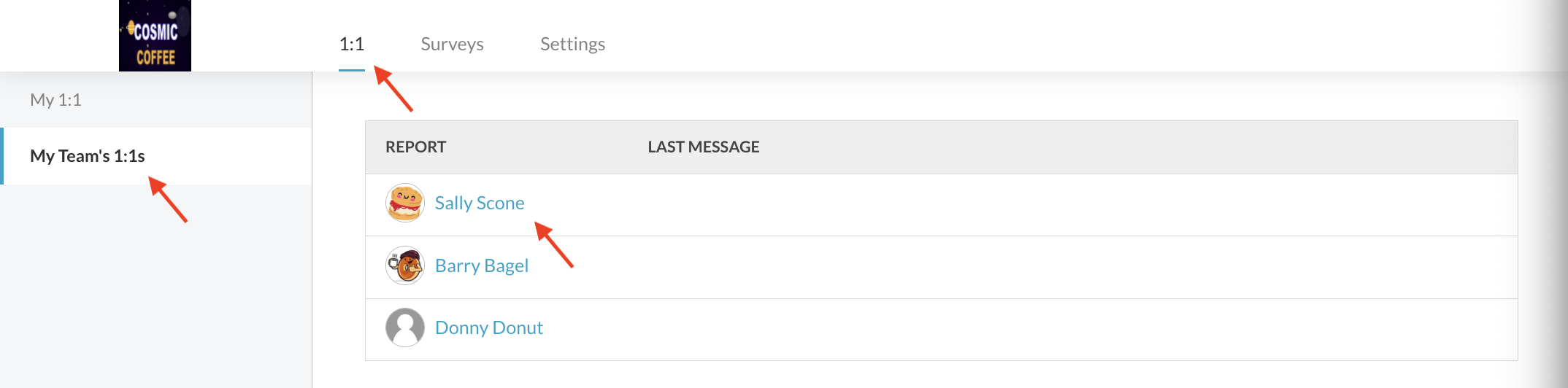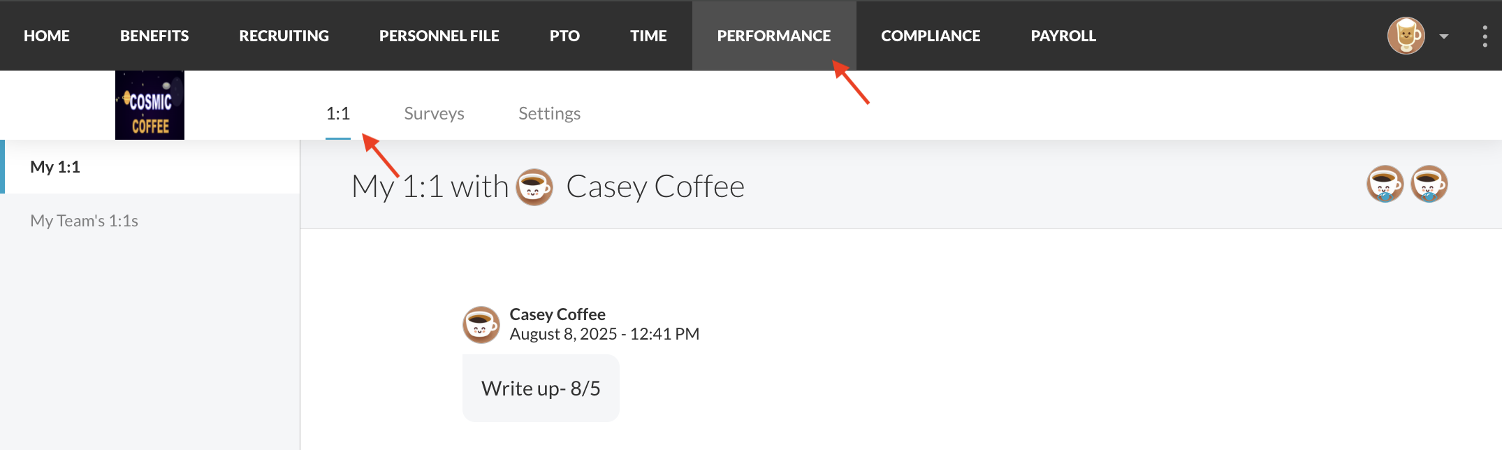 A 1:1 is a dedicated messaging thread between managers and their direct reports. While many Employers use this tool to submit agendas and notes for regular meetings, it's also valuable for documenting important events and milestones.