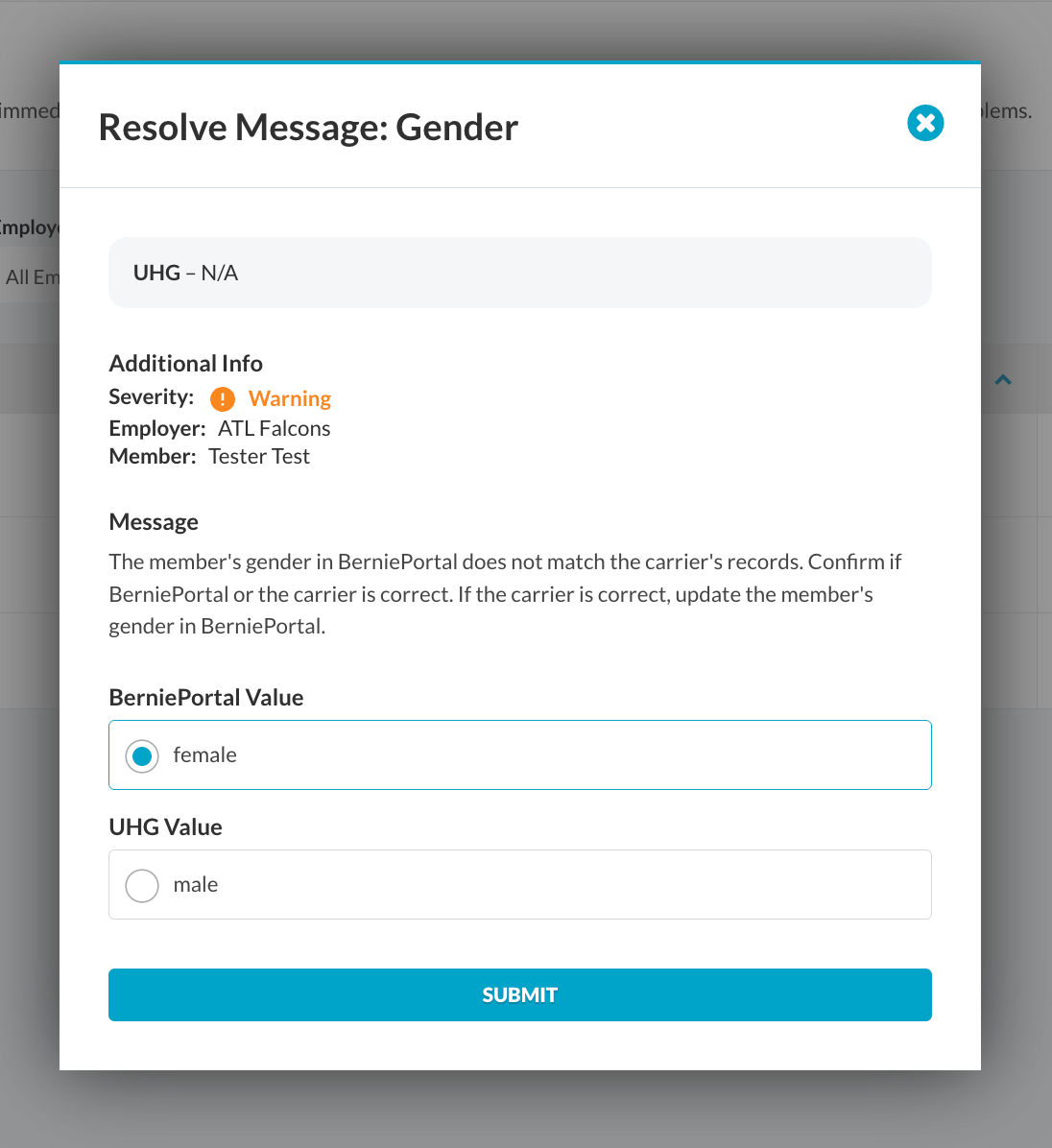 One of the most common Warning messages involves gender discrepancies between BerniePortal and carrier records.