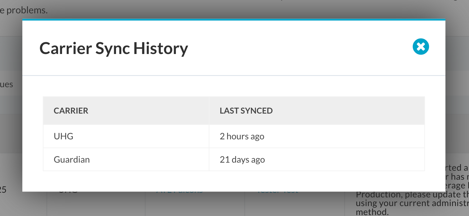 In addition to seeing when individual carriers last synced, you can access the Carrier Sync History to view sync patterns over time. This provides transparency into each carrier's sync frequency and helps you manage expectations about when updates will be communicated.